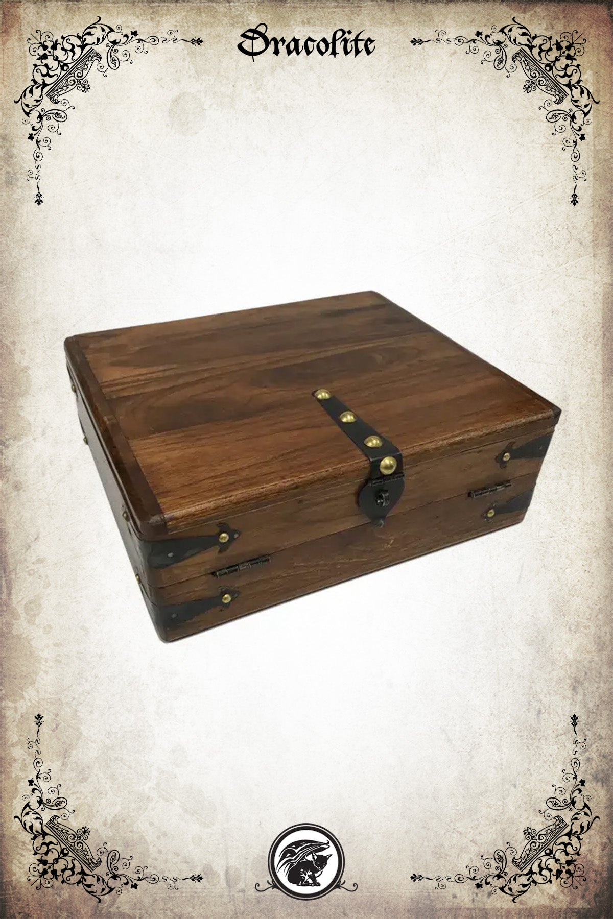 À l’intérieur, plusieurs compartiments modulables accueillent vos sceaux, cachets de cire, plumes de rechange, dés, bijoux ou petite monnaie. Un tiroir discret, équipé d’un anneau, vous permet de garder vos secrets ou réserves précieuses à l’abri des regards indiscrets.