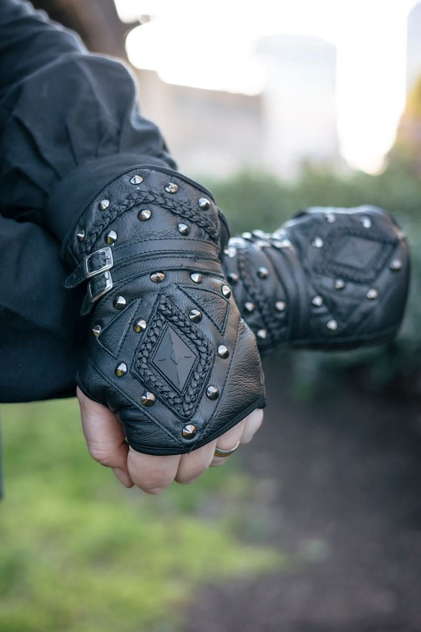 Modèles uniques de gants et guêtres en cuir pour le GN fabriquées à la main par des artisans.