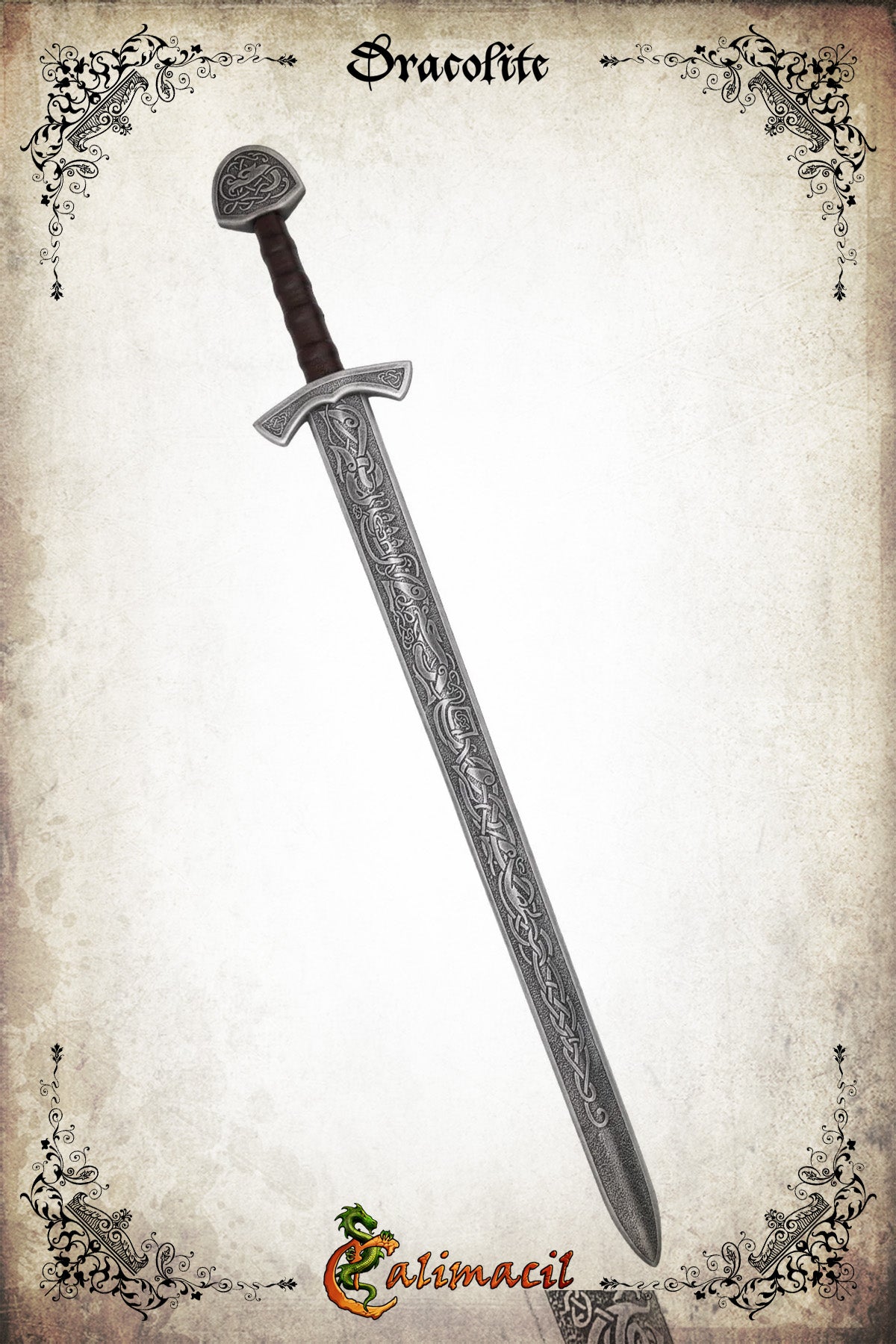 Issue d’une collaboration exclusive entre ArmStreet et Calimacil, cette épée LARP incarne à la perfection l’esprit viking à travers une réplique sécuritaire inspirée d’une somptueuse épée gravée. Chaque détail de la lame originale a été fidèlement reproduit en mousse Calimacil, offrant des motifs nordiques authentiques tels que des entrelacs, des serpents stylisés et des éléments métalliques qui évoquent l’impression d’une véritable relique sortie des grandes sagas nordiques.